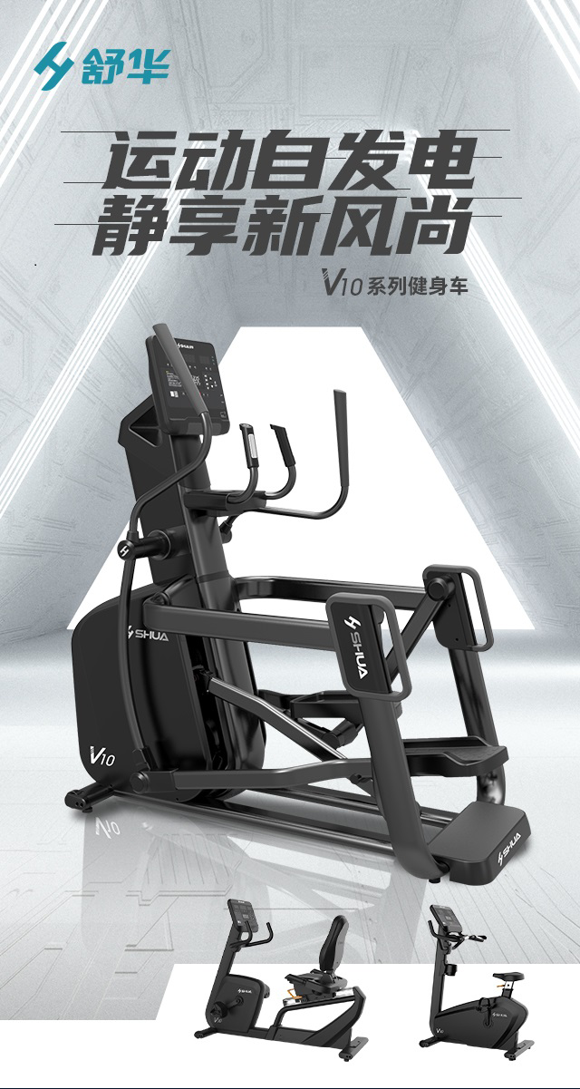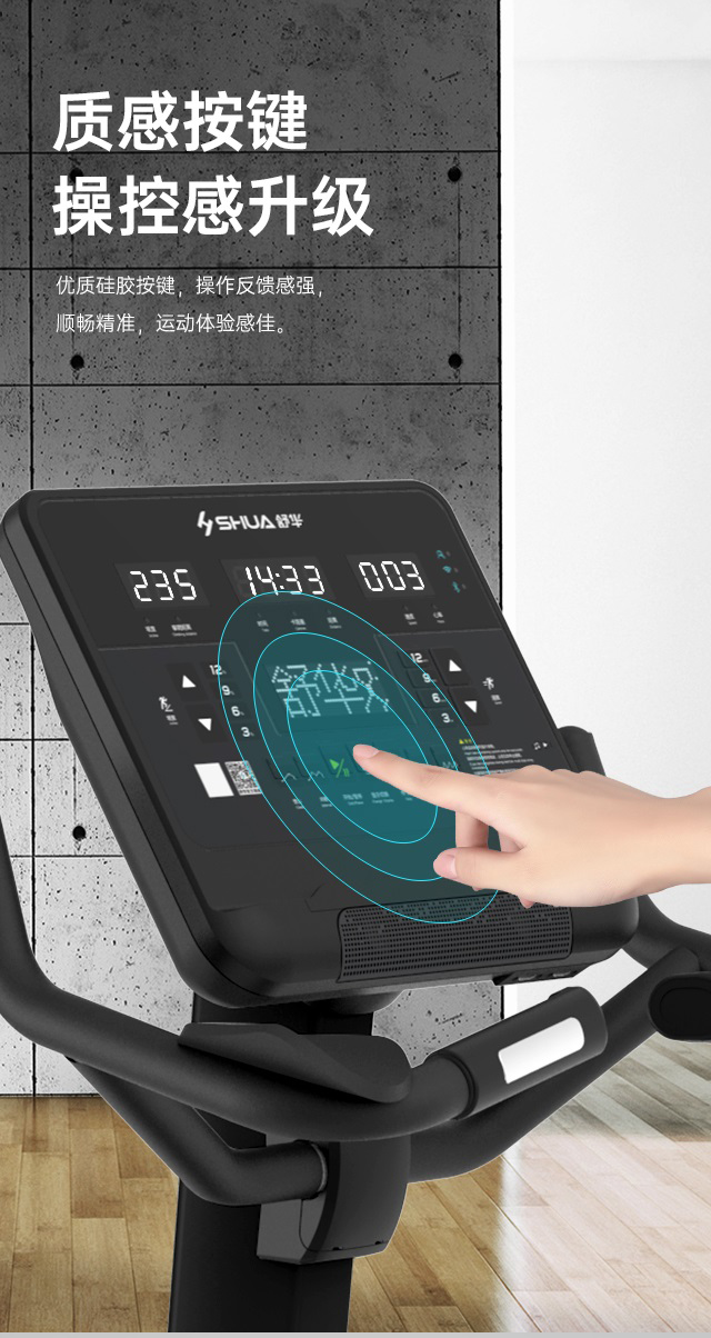 舒華立式商用健身車SH-B9100U(V10)觸屏版擁有超大顯示和操作屏幕, 可以任意設置阻力、時間和距離等參數,還可以即時顯示心跳和轉速等數據,同時,SH-B9100U提供多項科學運動處方,更輕松掌握運動節奏。